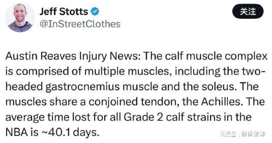 雖然湖人沒比賽,但根據(jù)媒體報道,紫金軍團(tuán)還是遇到多重考驗,其中最要命的一點,就是主要核心奧斯汀-里夫斯,或許會缺席到全明星周末了。原本按照湖人說法,里夫斯會在一個月后接受檢查,可這不代表他鐵定復(fù)出,尤其根據(jù)運動醫(yī)學(xué)專家杰夫-斯托茨補(bǔ)充,一旦球員遭遇二級小腿拉傷,平均會缺陣40天左右時間,倉促復(fù)出將增加嚴(yán)重傷病風(fēng)險。