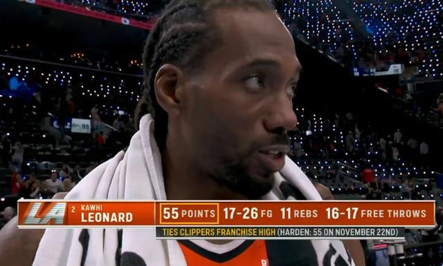 55分直接將倫納德生涯得分紀錄拉高了10分,也和哈登共享了快船隊史得分紀錄。這兩人的55分還都是這賽季,哈登的55分是快船最艱難的時期,倫納德傷缺全隊只能靠他;而倫納德的55分,則是徹底吹響了快船北伐的號角。