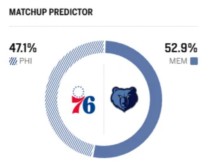 截止到目前,76人僅以16勝14負(fù)的戰(zhàn)績,慘遭3連敗,排名下降至東部第七。作為對比,灰熊隊(duì)則以15勝17負(fù)的戰(zhàn)績,排名從曾經(jīng)的西部墊底升至第九位。賽前,美媒ESPN對本場比賽進(jìn)行了勝率預(yù)測,76人勝率僅有47.1%,略占下風(fēng),灰熊勝率則為52.9%。