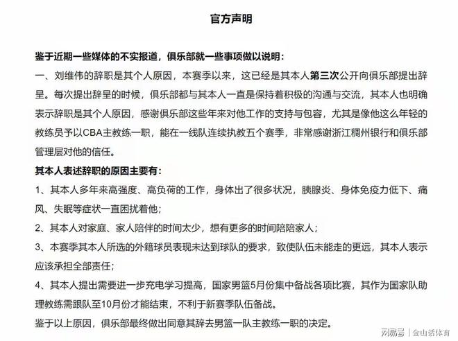 三天后,浙江稠州職業(yè)籃球俱樂(lè)部官方宣布,經(jīng)俱樂(lè)部慎重研究并報(bào)董事會(huì)批準(zhǔn),同意劉維偉辭去俱樂(lè)部男籃一隊(duì)主教練一職。值得一提的是,這份公告洋洋灑灑近千字,重點(diǎn)意思為,劉維偉辭職是其個(gè)人原因,俱樂(lè)部對(duì)他工作很支持和包容;本賽季選的外籍不好,他本人表示應(yīng)該承擔(dān)全部責(zé)任;當(dāng)年俱樂(lè)部不同意放威姆斯,是教練組選擇了放棄……