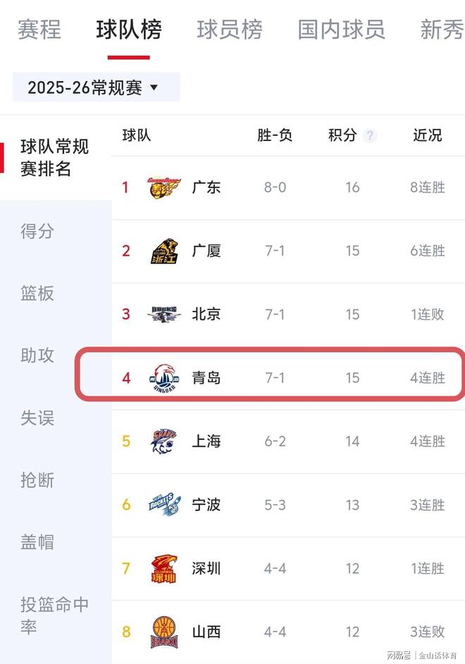 截止CBA常規(guī)賽前8輪,青島隊(duì)以1負(fù)7勝的戰(zhàn)績(jī),排在積分榜第4位。與上屆總決賽冠亞軍廣廈、北京隊(duì),戰(zhàn)績(jī)相同、并駕齊驅(qū)。