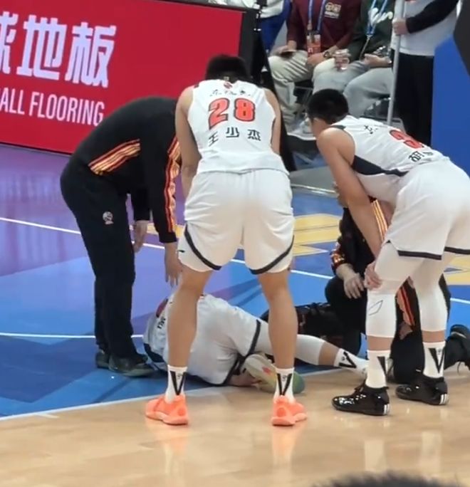 擔架車也進入場內(nèi),最終徐杰被隊友背出了場外,徐杰這場比賽只打了14分鐘,3中0拿到1分1籃板1助攻。