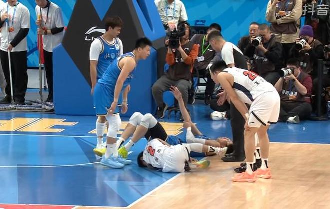 比賽第二節(jié),周琦行進中被薩姆納推倒,倒地過程中沖撞到徐杰的膝蓋,隨后擔架進場。徐杰在隊友的背負下離開比賽場地。