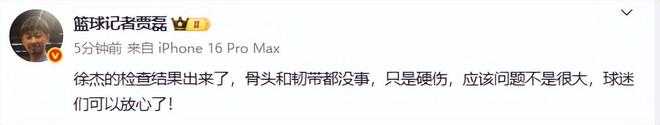據了解,徐杰受傷后第一時間被送到醫(yī)院檢查。據籃球記者賈磊報道,徐杰的檢查結果出來了,骨頭和韌帶都沒事,只是硬傷,應該問題不是很大,球迷們可以放心了!也可以這樣說,徐杰就是左腳踝嚴重扭傷。另據球迷群透露,徐杰左踝扭傷+內側副韌帶損傷,無骨折,傷情無大礙。不過徐杰肯定一時打不了比賽,從現場受傷情況來看,他起碼要休息半個月以上。